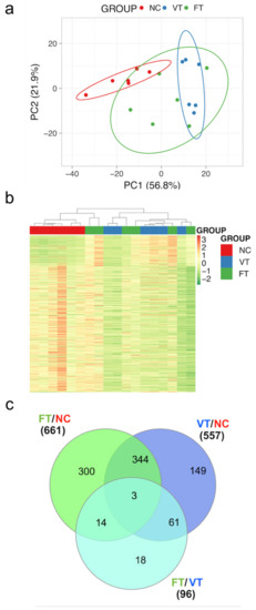 Identification of ART-associated metabolomic and gene expression in prepuberal offspring. (a) Principal components analysis and (b) Heat-Maps of all differential untargeted metabolites in the liver of offspring born after the embryo manipulation during the transfer procedure (FT, green) or vitrified embryos procedure (VT, blue) compared to nonmanipulated (NC, red). Each is individual plotted. (c) Venn diagram showing the overlap among the metabolites altered by the FT vs. NC, VT vs. NC and FT vs. VT for the analysis focused on embryo manipulation.