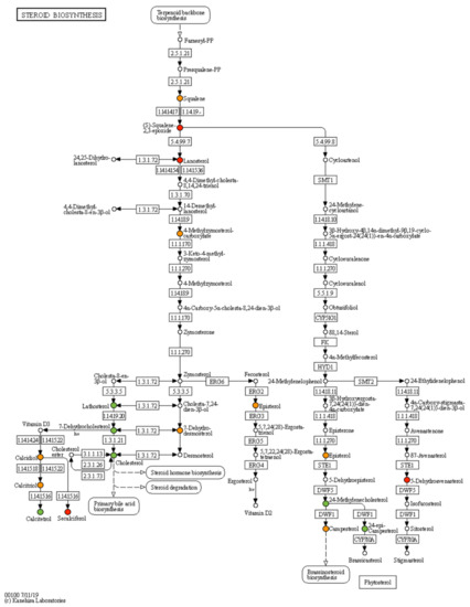 The complete metabolite dataset, its FC and DAMs are reported in Table 1. Most of the studied metabolites were downaccumulated (18 metabolites) in FT and VT samples. 3-alpha,7-alpha,12-alpha,26-Tetrahydroxy-5beta-cholestane metabolite was specifically downaccumulated only in VT samples (Table 1). At the same time, a general upaccumulation in lanosterol, S-squalene 2,3-epoxide and 20-alpha,22-beta-dihydroxycholesterol was found in VT and FT livers over NC (Table 1). Among them, 19 metabolites were detected in steroid biosynthesis (Figure 6).