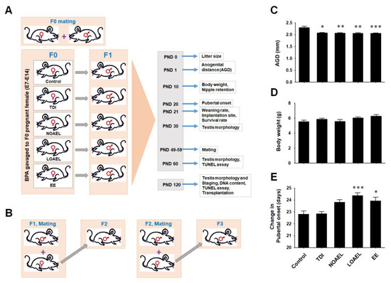 Figure 1. Experimental design (A,B), anogenital distance (C), body weight (D), and pubertal onset changes (E) in F1 male offspring. (A) After mating, pregnant female mice were gavaged with different bisphenol A (BPA) doses [tolerable daily intake (TDI) (50 µg/kg bw/day), no-observed-adverse-effect-level (NOAEL) (5 mg/kg bw/day), and lowest-observed-adverse-effect-level (LOAEL) (50 mg/kg bw/day); see detailed dose description in text], control (corn oil), and positive control (ethynylestradiol; EE). (B) Mating scheme to produce descendants (F1 to F3 generation). Age-matched nontreated females were used (PND 49–59). No inbreeding was performed. (C) Anogenital distance (AGD) of F1 male pups at PND 1, measured in millimeters. (D) Body weight of F1 male pups at PND 10, measured in grams. (E) Changes in days of pubertal onset for F1 offspring. Data (CE) were generated from 23 male offspring per group. Data analyzed using one-way analysis of variance (ANOVA) where asterisk (*) indicate significant differences compared with control (* p < 0.05, ** p < 0.01, and *** p < 0.001).
