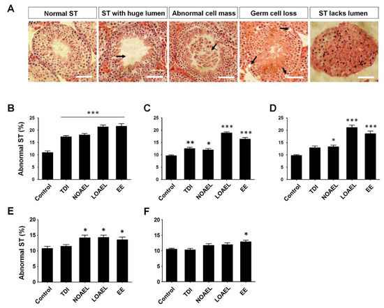 Figure 2. Testicular cross section and the presence of abnormal seminiferous tubules (STs) due to bisphenol A (BPA) exposure. (A) Hematoxylin and eosin-stained testicular cross-sections presenting normal STs along with abnormal STs, characterized by a huge lumen (>40 µm in diameter), abnormal cell mass, loss of germ cells, and lack of lumen (pictures represent STs sections at PND 120). Arrows in the images indicate the positions of abnormality. Scale bar = 50 µm. Percentages of abnormal tubules are presented as bar graphs; (B) F1 offspring at PND 30 (n = 15 mice/group), (C) F1 offspring at PND 60 (n = 15 mice/group), (D) F1 offspring at PND 120 (n = 15 mice/group), (E) F2 offspring at PND 120 (n = 20 mice/group), and (F) F3 offspring at PND 120 (n = 15 mice/group). Data analyzed using one-way analysis of variance (ANOVA) where asterisk (*) indicate significant differences compared with control (* p < 0.05, ** p < 0.01, and *** p < 0.001).