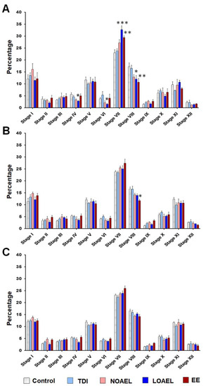 Figure 3. Staging of the seminiferous epithelium (SE). Testicular sections were stained with periodic acid-schiff (PAS)-hematoxylin, followed by staging of the SEs to evaluate differences in SE staging upon BPA exposure. The bar graphs represent the staging patterns of (A) F1 offspring at postnatal day (PND) 120 (n = 20 mice/group), (B) F2 offspring at PND 120 (n = 15 mice/group), and (C) F3 offspring at PND 120 (n = 15 mice/group). For each stage, one-way analysis of variance (ANOVA) was used to identify significant differences between exposure and control groups (* p < 0.05, ** p < 0.01, and *** p < 0.001).