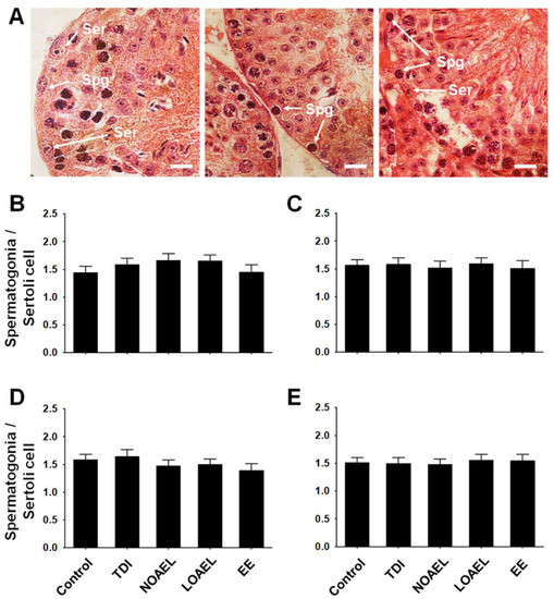Figure 4. Ratio of spermatogonia and Sertoli cells. The ratio of total number of spermatogonia and Sertoli cells in the same SE was measured. (A) Testicular cross-sections show spermatogonia (Spg) and Sertoli cells (Ser), which usually appeared at stages I-VI. Scale bar = 10 µm. Bar graphs represent the ratios of spermatogonia and Sertoli cells of (B) F1 offspring at PND 60 (n = 12 mice/group), (C) F1 offspring at PND 120 (n = 15 mice/group), (D) F2 offspring at PND 120 (n = 15 mice/group), and (E) F3 offspring at PND 120 (n = 15 mice/group), respectively.