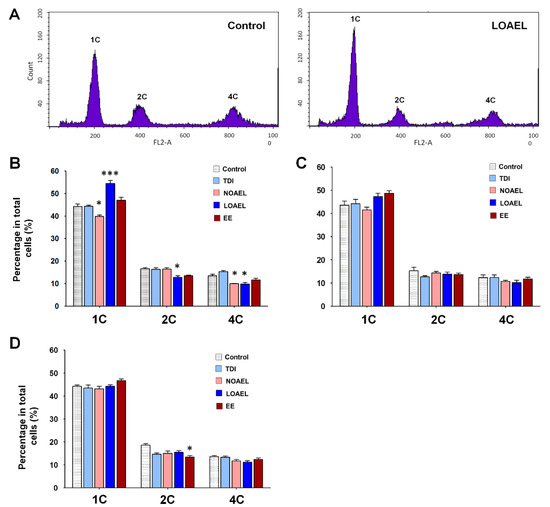 Figure 5. Changes in the proportion of testicular cell populations upon bisphenol A (BPA) exposure. (A) Representative images of control and lowest-observed-adverse-effect-level (LOEAL) doses of BPA, derived using fluorescence-activated cell sorting (FACS). 1C, 2C, and 4C indicate the proportion of haploid (1C; total spermatid), diploid (2C; spermatogonia and secondary spermatocytes), and tetraploid (4C; primary spermatocytes and G2/M cells) germ cells in the testicle, respectively. (B), Bar graphs represent the percentage of haploid (1C), diploid (2C), and tetraploid (4C) germ cells among the total cells of F1 offspring (PND 120). (C,D) Percentage of germ cells (1C, 2C, and 4C) of F2 and F3 offspring are represented, respectively. Data were analyzed using one-way analysis of variance (ANOVA) where significant differences (*) have been calculated upon comparison of exposure groups with control group (n = 10 mice/group; * p < 0.05 and *** p < 0.001).