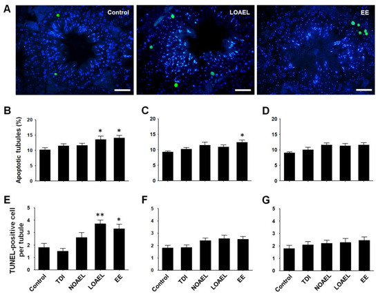Figure 6. Bisphenol A-induced apoptosis in testicular germ cells. Terminal dUTP nick-end labeling (TUNEL) assay was performed to detect apoptotic germ cells in seminiferous epithelium (SE). (A) Images represent the position and number of TUNEL-positive germ cells (green) among other cells (blue; DAPI-stained) of SE from control, lowest-observed-adverse-effect level (LOAEL)-exposed, and ethinylestradiol (EE) groups. Scale bars = 50 µm. Bar graphs represent the percentages of apoptotic tubules in (B) F1, (C) F2, and (D) F3 offspring at their PND 120. Similarly, graphical presentation of TUNEL-positive germ cells per tubule in (E) F1, (F) F2, and (G) F3 offspring are also shown. Data were generated from at least 15 mice/group and analyzed using one-way analysis of variance (ANOVA) where * p < 0.05 and ** p < 0.01, compared to control.