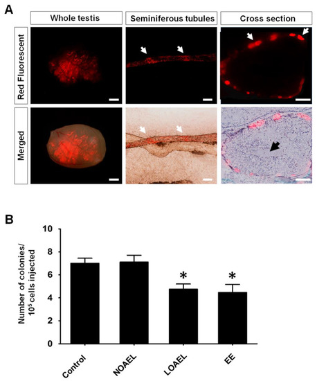 Figure 7. Transplantation of germ cells into recipient mice and analysis of recipient testes. Germ cell transplantation was carried out to evaluate the (bisphenol A) BPA-induced effect on the stemness properties of spermatogonial stem cells (SSCs). Donor germ cells collected from F1 postnatal day (PND) 120 offspring were stained with PKH26 (red fluorescence). (A) Images in the left panel show fluorescence expression of seminiferous tubules (STs) and merged image of STs inside the recipient testis (scale bar = 2 mm). The middle panel represents fluorescence and merged view of the colonization of donor germ cells inside the recipient ST. White arrows represent the places of colonization, scale bar = 200 µm. The right panel represents a cross-section of the fluorescence and merged views of the colonization of donor spermatogonia (red) on the basement membrane (white arrows) of the recipient ST (black arrow indicates sperm tails generated from donor SSCs; scale bar = 40 µm). (B) Bar graph represents the number of donor cell-derived colonies per 105 transplanted germ cells. Total numbers of mice/testes analyzed were 8/14, 8/15, 10/18, and 8/14 for control, no-observed-adverse-effect-level (NOAEL)-, lowest-observed-adverse-effect-level (LOAEL)-, and ethinylestradiol (EE)-exposed groups, respectively. Asterisk (*) indicates significant differences (* p < 0.05) compared to the control.