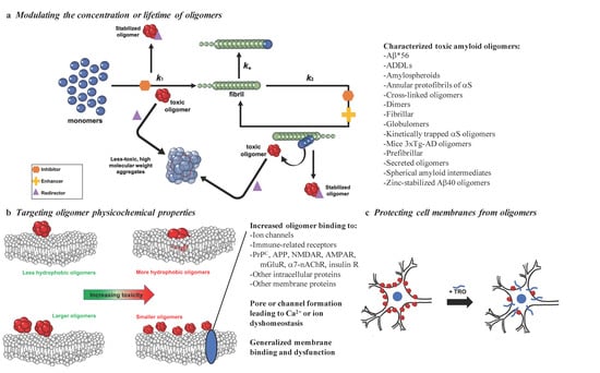 In this review, we analyze recent strategies to suppress the toxicity linked to neurodegenerative diseases with a critical focus on demonstrated molecular agents that have shown the ability to combat the toxicity caused by oligomers. In particular, we assess species that (1) modulate populations of oligomers by perturbing their respective protein aggregation reactions via inhibiting, enhancing, or redirecting its reactive flux network (Figure 1a and Section 3), (2) target directly the properties of oligomers linked to their ability to induce cell damage (Figure 1b and Section 4), (3) protect cell membranes by targeting oligomer interactions (Figure 1c and Section 5), or (4) preserve the health of cells through all of the above by regulation of the protein homeostasis network (see Section 6). These approaches demonstrate examples of potential therapeutics designed to suppress the negative effects of toxic oligomeric assemblies, as well as highlight the diversity of mechanisms by which amyloid aggregation can be targeted. The hope is that future work using these promising lead strategies will culminate in the development of therapeutically relevant treatments that can arrest the devasting effects of neurodegeneration by targeting specifically misfolded protein oligomers.