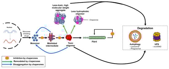 In order to be functional, the proteins that constitute the cellular proteome need to fold properly and remain soluble. The maintenance of a functional proteome is achieved through the action of the protein homeostasis system, which regulates the synthesis, folding, transport, and degradation of proteins, guaranteeing their functionality and mitigating their aggregation []. This system assists in protein folding, remodeling misfolded proteins back to folding intermediates, disaggregating intermediate aggregates, and assisting in protein turnover or aggregate removal via the ubiquitin–proteasome or autophagosomal–lysosomal systems (Figure 2) [,]. This quality control system declines over time as a function of ageing, often resulting in age-related comorbidities [,]. Over the course of a life, the gradual accumulation of certain mutations can result in a larger pool of aggregation-prone species. Evidence from model organisms suggests that as genetic and epigenetic longevity controls affect a downregulation in the expression of molecular chaperones, it becomes increasingly difficult for the protein homeostasis network to adequately keep pace with the growing demand of proteotoxic species [].