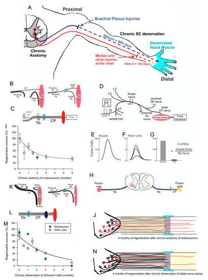 Figure 3. A. Motoneurons remain without targets (chronic axotomy) as they regenerate after proximal nerve injuries such as brachial plexus injuries and Schwann cells (SCs) in the denervated distal nerve stumps remain chronically denervated. At the slow rate of 1 mm/day regeneration rate in human, a year or more will pass for regenerating nerves to reach hand muscles, which are generally believed to atrophy and be replaced by fat (A). To isolate the effects of chronic axotomy from chronic denervation, the tibial (TIB) nerve was cut and the stumps sutured to innervated muscle prior to a cross-suture of TIB nerve to freshly denervated common peroneal (CP) distal nerve stump (B) and tibialis anterior (TA) muscle reinnervation was assessed by recording muscle and motor unit (MU) isometric forces at least 4 months later (C), as shown in more detail in (D). After cutting all nerves other than the CP nerve to the TA muscle, the sciatic nerve was stimulated at 2x threshold to evoke and record isometric muscle twitch (and tetanic—not shown) force (E). Thereafter, ventral root filaments were dissected to stimulate, at 2x threshold, single CP nerve fibers and record all-or-none MU twitch forces (F). The number of MUs was determined by dividing TA muscle force by average TA MU forces to give the number of TIB nerves that reinnervated the TA muscle (G). Numbers of axotomized motoneurons regenerating axons into the freshly denervated CP nerve stumps were also counted after their labelling by applying retrograde dyes, either fluororuby or fluorogold, to the distal nerve stump 10 mm from the cross-suture site (H). Plots of the numbers of reinnervated MUs and motoneurons regenerating their axons as a function of the days of axotomy prior to TIB-CP cross-suture, demonstrated an exponential decline to 33% of the numbers after immediate cross-suture at 0 days (I). The outgrowth of axons across the suture site is shown diagrammatically in (J). In order to examine the effects of chronic Schwann cell denervation, the CP nerve was transected and the proximal stump sutured to innervated muscle before the TIB-CP cross-suture of the freshly cut TIB nerve to the chronically denervated CP nerve stump to record muscle and MU forces (K) or to apply retrograde dye to the regenerated nerve 10 mm from the suture site (L). The numbers of reinnervated MUs and TIB motoneurons that regenerated their axons into the CP nerve stump, declined exponentially to <5% within 6-months of CP distal nerve chronic denervation (M), as illustrated figuratively in (N). Adapted from [35,36].