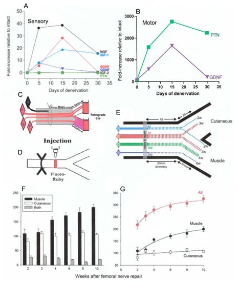 Figure 4. The expression of neurotrophic factors in Schwann cells in denervated nerve stumps and their role in preferential reinnervation of appropriate pathways by regenerating femoral nerves. The time course of the gene expression measured with rtPCR in the cutaneous sensory nerve branch of the femoral nerve (A) and in ventral root motor nerves (B). The mRNA normalized to values in innervated nerve stumps increased to a peak at 15 days and receded thereafter. Two different retrograde dyes (fluorogold and rubyred) were applied for retrograde labelling and counting of the motoneurons that regenerated their axons into appropriate and inappropriate motor (muscle) and sensory (cutaneous) nerve branches (C), and 1.5 mm across the site of microsurgical repair of the transected femoral nerve (D). The regeneration of the motor axons is non-selective at 2 and 3 weeks for the appropriate and inappropriate motor and sensory femoral nerve branches (E). However, as also shown by the data in (F,G), motoneurons progressively regenerate their axons preferentially into the motor branch in the time frame in which Schwann cells in the sensory and motor nerve branches show selective expression of growth factors (A). The number of motoneurons that had regenerated their axons non-selectively into both branches did not change over time (F,G). Adapted from [33,98,99].