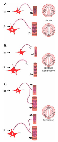 Figure 5. Non-selective reinnervation of muscles after peripheral nerve surgery. The diagrammatic representation of the innervation of the intrinsic abductor (AB) and adductor (AB) muscles of the vocal cords by inspiration and phonation (speaking) in normal (A), denervated (B), and reinnervated (C) intrinsic muscles. The large and small motoneurons innervating the AB and AD muscles, respectively, represents the 4:1 ratio of the number of the motoneurons innervating the AB and AD muscles. After bilateral denervation, the vocal cords do not close during phonation so that speech is severely impaired (B). After surgical repair of the laryngeal nerve, the axotomized motoneurons randomly reinnervate the AB and AD muscles (C) with the result that the vocal cords are effectively paralyzed in a position of openness that disallows effective speech. Adapted from [104].