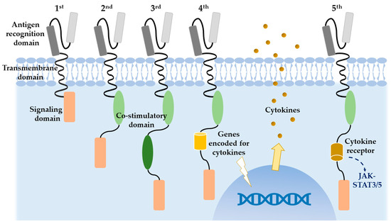 CARs are artificial recombination proteins that contain three main parts—an extracellular antigen-recognition domain, a transmembrane domain, and an intracellular tyrosine containing activation motifs [4,5]. The part outside cell membrane is an antigen-targeting moiety purified from a monoclonal antibody, consisting of a single-chain variable fragment (scFv), a fusion protein of the variable regions of heavy and light chains. Once bound to tumor antigens, it is responsible for triggering T-cell activation and leads to cytokine release, cytolytic degranulation, and T-cell proliferation [6]. As for the intracellular domain linking to extracellular domain through a transmembrane domain, it determines the quality, strength, and persistence of a T-cell response to tumor antigens [7]. Different fragments are incorporated for corresponding malignancies on the outer domains, while the inner domain provides the space for improving the efficacy of CAR T-cell therapies and yields five generations of CARs to date (Figure 1). The initial generation of CARs, whose endodomain contains only CD3-ζ chain or FcεRIγ, supports inadequate T-cell expansion, a short in vivo life span and insufficiently secreted cytokines [8,9,10]. An intracellularly costimulatory domain CD28 [11,12] or 4-1BB [13] was then added to generate the second generation of CARs, which ameliorated T-cell proliferation, response to tumor antigens, and in vivo persistence [14]. To achieve higher potency, CD28 and 4-1BB were combined together, and yielded the third generation [15,16]. As for the fourth generation, in addition to adoptive immunity, interleukin-12 (IL-12) or other cytokines (such as IL-8, 9, 15, and 18) was tethered to the endodomain of the second generation, in an attempt to activate innate immunity at the same time. This manipulation led to the recruitment of tumor infiltrating T-cells (TILs) and natural killer cells that were able to eliminate antigen-negative cancer cells [17]. This amalgamation is termed as T-cell redirected for universal cytokine-mediated killing (TRUCKs) [14]. Activating cytokines not only modifies the tumor microenvironments but also results in prolong activation of CARs and protects T-cell from activation-induced cell death. This finding is currently in its early phase of clinical trials [18]. Recently, fifth generation of CARs was proposed as a product of insertion of an IL-2 receptor β-chain domain, with a binding site for the transcription factor STAT3. This can induce robust cytokine (JAK–STAT3/5) signaling in the targeted tumor tissues and reduce systemic side effects [19], thereby broadening the use of CAR T-cell therapy to a variety of other diseases.