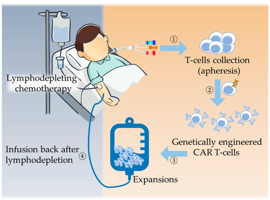 Current regimen of CAR T-cell therapy follows a general protocol (Figure 2)—patient’s T-cells are first collected, purified, and activated with antibodies or antibody-coated beads artificially. This is followed by transduction of CAR molecule into T-cell using transient transfection via lentivirus, retrovirus transduction, or electroporation [20]. The modified CAR T-cells were then multiplied in vitro to a sufficient amount before being infused back into the patient. Prior to the transfusion, the patient receives lymphodepleting chemotherapy, such as various doses of cyclophosphamide alone, fludarabine and cyclophosphamide, pentostatin and cyclophosphamide, bendamustine-based regimens, and several disease-specific regimens determined at physician’s discretion. The addition of lymphodepletion chemotherapy was anecdotally shown to increase persistence of CAR T-cell therapy. No regimen was clearly shown to be superior in terms of efficacy for optimizing CAR T-cell activity, nor is it clear which particular method is more toxic than another [20].