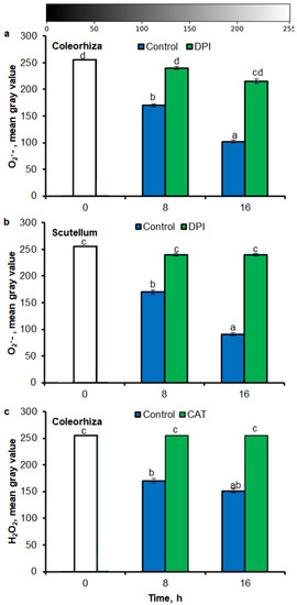 The NBT histostains demonstrate that during incubation of seeds in presence of water for 8 h, content of O2•− was increased in coleorhiza and scutellum 1.5 times in comparison to the same parts of embryo from dry seeds (Figure 5a,b). During further incubation up to 16 h, O2•− showed about 2.5 and 3 times higher level in coleorhiza and scutellum, respectively, than in coleorhiza and scutellum from dry embryo. The signal of O2•− was fully suppressed when the seeds were incubated in presence of DPI for 8 and 16 h. After 8 h of imbibition in water, the amount of H2O2 was ca. 1.7 times higher in coleorhiza than in coleorhiza from dry embryo and remained constant up to 16 h (Figure 5c). The signal of H2O2 was fully suppressed when the seeds were incubated in presence of CAT for 8 and 16 h.