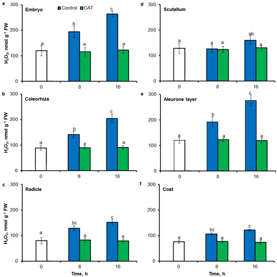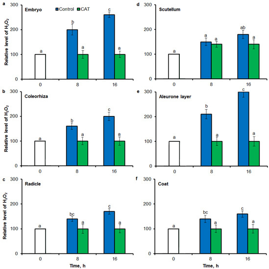After 8 h of incubation in water, level of H2O2 was increased in embryo (Figure 9a), coleorhiza (Figure 9b), radicle (Figure 9c), aleurone layer (Figure 9e) and coat (Figure 9f) of seeds; after this time content of H2O2 was about 1.6-fold higher than content of H2O2 in the same parts of dry seeds. Prolongation of incubation up to 16 h increased the content of H2O2; in this time point, H2O2 showed about 1.7–2.2 times higher level than in dry seeds. Furthermore, the level of H2O2 in scutellum was not significantly changed throughout the whole period of imbibition (Figure 9d). The content of H2O2 was decreased when the seeds were incubated in presence of CAT.