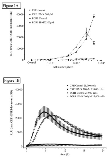 2.1.1. Influence of Cell Number and Concentration of Luciferin on CRE- and EGR1-Dependent Luciferase Activity