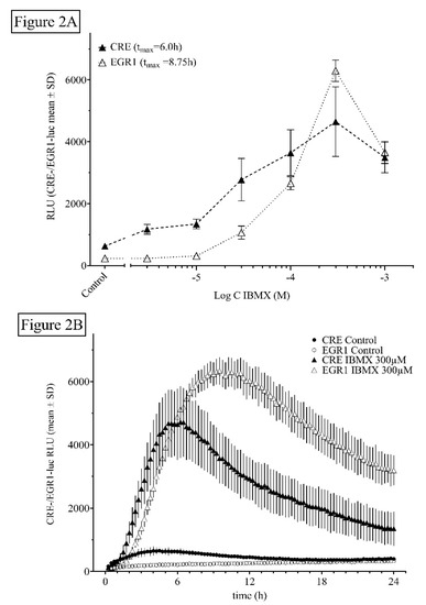 The present work characterized CRE- and EGR1-dependent transcriptional responses of two reporter cell lines, derived from the immortalized mouse hippocampal neuronal cell line HT22 [25,26], to PDE inhibition and other modes of cAMP elevation and modulation. Both HT22CRE- and HT22EGR1-dependent activities displayed a robust dose- and time-dependent response to PDE inhibitors like IBMX and rolipram, the adenylate cyclase activator forskolin [4,27], and the highly PKA-specific activator Sp-5,6-DCl-cBIMPS [16,28,29].