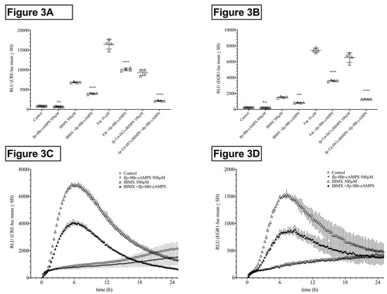The time course graphs showing IBMX and IBMX plus Rp-8Br-cAMPS revealed that, besides the reduction of the maximal activity, Rp-8Br-cAMPS application also delayed the onset of activity in both HT22CRE- and HT22EGR1 cells (Figure 3C,D). Note that, besides the reduction of the maximum activity, Rp-8Br-cAMPS application also delayed the onset of activity. It should be noted that these inhibition experiments were executed using high, effect-saturating concentrations of the activators. It can be expected that, at lower doses, the inhibition by Rp-8Br-cAMPS co-application will be even higher. The effect of 100 µM IBMX, for example, was reduced by 80% by Rp-8Br-cAMPS (500 µM), similar to what was previously shown for forskolin (1 µM) in HT22CREluc cells [14]. Here, we chose effect-saturating concentrations of IBMX, forskolin, and Sp-5,6-DCl-cBIMPS to compare the different PKA-activating agents and principles for the purpose of direct comparison.