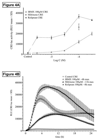 The isoform-specific PDE inhibitors rolipram (PDE4) and milrinone (PDE3) displayed different HT22CRE activity profiles in term of dose-dependency, time to reach maximal response, and time to return to basal levels. Whereas rolipram appeared equally maximally effective to IBMX in HT22CREluc activity enhancement, it was active already at sub-micromolar concentrations. In the dose-dependency experiments, rolipram showed an early plateau between 1 and 100 µM and then increased further, similar to IBMX. It was tempting to speculate that the first plateau was due to specific PDE4 inhibition, whereas the second rise was due to recruitment of non-specific targets like other PDEs. These findings suggest a prominent role of PDE4 in HT22 cells as previously shown for primary hippocampal neuronal cell and slice preparations and in mice and humans in vivo [13].
