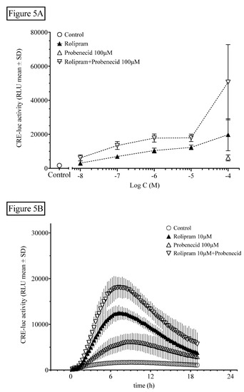 To our knowledge, it was also observed here for the first time that inhibition of OAE by probenecid not only further elevated rolipram-induced HT22CREluc activity, but was also active, when applied alone. The intracellular concentration of cAMP is determined not only by the synthesis rate of adenylate cyclase, which includes the availability of cytosolic ATP and the degradation of cAMP by PDE, but also, additionally by the export of cAMP by passive membrane transport systems of which the most prominent ones are OAEs. A very minor proportion of intracellular cAMP is bound to the various cAMP-binding proteins and is usually so small that it can be neglected [8] Since probenecid only inhibits the export of cAMP through OAE, but does not change either the synthesis or degradation, it may be speculated that basal cAMP synthesis in HT22 cells is high.