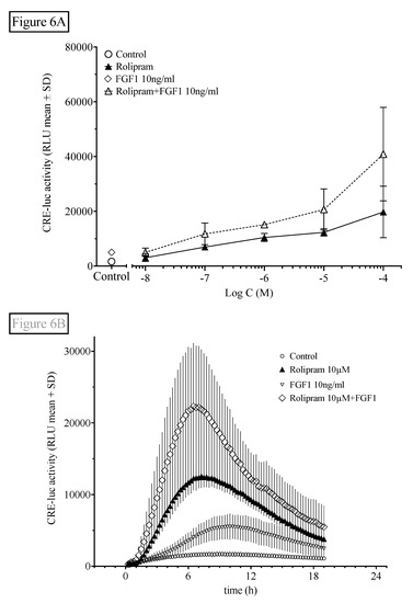 Like probenecid (Figure 5), FGF1 also significantly elevated HT22CREluc activity when applied alone (compared with control; Tukey’s multiple comparison test; p < 0.01) and led to further elevation of the maximal activity when combined with rolipram (Figure 6A), suggesting an additive mode of action similar to rolipram in combination with probenecid shown above. However, with rolipram (100 µM), the addition of FGF1 (10g/mL) was not significantly additive (Figure 6B).