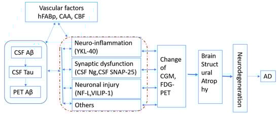 In an animal model of AD, Ng levels increased in CSF when neurodegeneration was induced, peaking after 2 weeks, while it decreased in a brain when CSF Ng was a biomarker of synaptic degeneration [21]. CSF Ng levels are correlated with brain structure atrophy of hippocampal volumes, entorhinal volumes, and parahippocampal volumes in AD and with amyloid load in preclinical AD [112]. High baseline cerebrospinal fluid neurogranin levels in a mild cognitive impairment group were correlated with longitudinal reductions in cortical glucose metabolism and hippocampal volume at clinical follow-up [20]. CSF levels of synaptic and neuronal integrity biomarkers, amyloidogenic processing, and YKL-40 is associated with loss of structural integrity of brain regions implicated in the earliest stages of AD [95]. Baseline CSF VILIP-1 levels predict whole-brain, hippocampal, and entorhinal atrophy rates at least as well as tau and p-tau181 in early AD. Cognitively normal controls whose CSF VILIP-1, tau, or p-tau181 levels were in the upper tercile had higher rates of whole-brain, hippocampal, and entorhinal atrophy [97]. Almost all factors of neuroinflammation, synaptic function, neuronal injury, and neuronal degeneration experience changes prior to changes of the MRI findings and metabolism. A reduction in posterior cingulate glucose metabolism preceding a reduction in hippocampal volume has been observed [113]. What we know from the literatures is that the biomarkers experience changes prior to changes in metabolism, and then MRI findings follow the alternations of Abeta and Tau proteins, as shown in Figure 1. However, determining how long it takes from the change in biomarkers to the change in brain metabolism and structure, and the key biomarker pathway, requires further research.