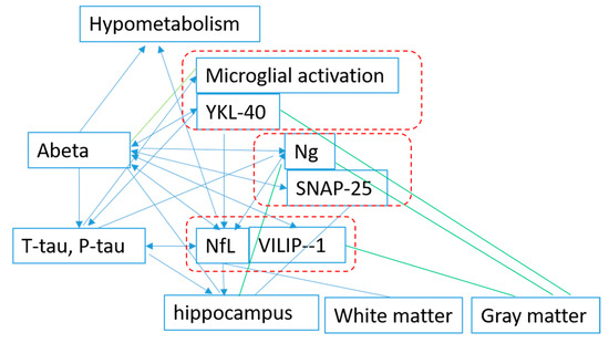 Association among the proteins based on studies published. Aβ: beta amyloid; Ng: neurogranin; SNAP-25: synaptosomal-associated protein 25; YKL-40: chitinase-3-like protein 1; NfL: neurofilament light chain; VILIP-1: visinin-like protein 1; Blue: association; Green: negative association.