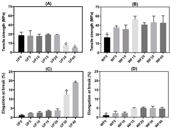 Figure 1 presents the tensile strength (σ, MPa) and elongation at break (ε, %) of the PT/CHT/Gly films. Stress–strain curves of one replicate for each film are shown in Figure S1. The Gly content in the blends significantly changed the σ values. The mean σ values increased from 27 MPa (UF5) to 41 MPa (WF5), 26 MPa (UF10) to 38 MPa (WF10), 29 MPa (UF15) to 55 MPa (WF15), 28 MPa (UF20) to 43 MPa (WF20), 11 MPa (UF30) to 50 MPa (WF30), and 8.0 MPa (UF40) to 49 MPa (WF40) (Figure 1A,B). The increase in the Gly content from 5.0 to 20 wt % did not significantly change the value of σ for the UFs. This effect may be related to the low Gly concentration in the blend compared with the total polysaccharide mass [15]. Gly at 30 and 40 wt % significantly reduced the σ (p ≤ 0.05). In these cases, the Gly acted as a plasticizing agent in the films, reducing the σ (Figure 1A).