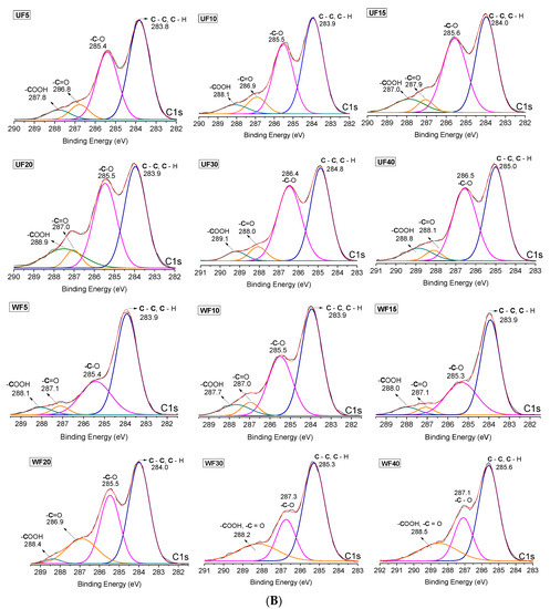 The high-resolution XPS spectra (C1s) of the UFs present –C–O peaks with high intensities due to the presence of Gly. This effect is evident with the 20 wt % Gly concentration (Figure 2B). After washing, the –C–O peaks present low intensities, indicating Gly removal from the WF surfaces. The C1s envelopes obtained for WF30 and WF40 are different from the others. The peaks ascribed to the chemical –COOH and –C=O groups overlapped (Figure 2B). This effect is related to the structural reorganization of the polymer chains during the washing process.