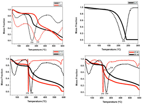 TGA/DTG curves of the UFs (UF15 and UF40) and WFs (WF15 and WF40) suggest similar water and volatile compound contents (between 16% and 20%). However, the second thermal event related to degradation occurs at higher temperatures for the WFs. The UF40 TGA curve presents an additional event at 234 °C. Probably, this event occurs due to the presence of Gly (Figure 3). The WFs show high thermal stability due to structural reorganization of the materials in the films. This finding corroborates with the mechanical property measurements, indicating that the films’ components interact more between each other in the WFs than in the UFs.