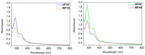 UV-Vis absorption spectra of the films are presented in Figure 4. The UFs have greater absorbance than the WFs. The Gly in the UFs can absorb UV light. The films’ thickness also influences the light barrier capacity. The WFs’ thickness (WF15 = 0.028 mm and WF40 = 0.029 mm) is less than the respective UFs’ thickness (UF15 = 0.038 mm and UF40 = 0.055 mm, Table 2). Therefore, the UF40 shows the highest absorbance in the ultraviolet range (Figure 4). When the Gly content increases from 15% to 40%, the protective effect is still more enhanced due to the greater film thickness and Gly’s capacity to absorb UV light [37].
