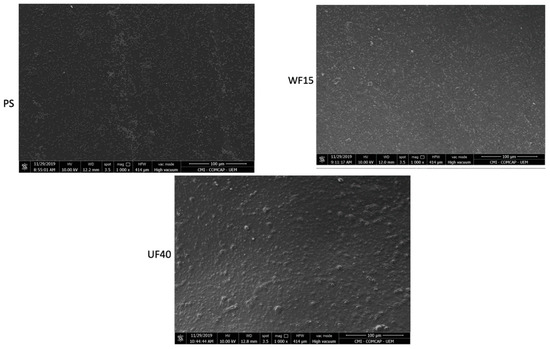 The anti-adhesive capacity is supported by the UF40 results regarding its higher surface wettability than the WF15 and PS (WCA = 82° [49]). The cell walls of Gram-negative bacteria are coated with a thin layer of glycoproteins and covered by a thick layer, mainly composed of lipoproteins and lipids. In this way, films and coatings with hydrophobic surfaces should interact better with the microbial cells, favoring adhesion. Hydrophilic surfaces should prevent the attachment of E. coli cells [13,14,49,50].