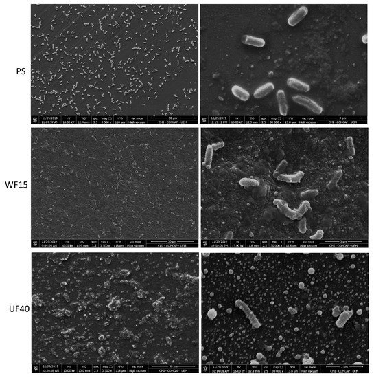 Therefore, we performed anti-adhesive and proliferation tests by seeding E. coli cells with the films for 24 h. SEM images show no adhesion of microbial cells with regular morphology onto the UF40 surface (Figure 5). On the other hand, we found E. coli cells with normal integrity on the WF15 and PS surfaces. The UF40 has anti-adhesive activity against E. coli. These findings agreed with the outcomes reported in the disk diffusion approach. The PS was selected as a negative control because it does not have antimicrobial and anti-adhesive activities, and it is also used in food packaging applications [44,45]. As expected, bacterial cells with regular morphology completely covered the PS surface after 24 h of exposure (Figure 5).