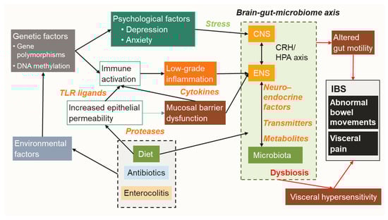 After sensing particular microbial patterns by the TLRs, several inflammatory and regulatory cytokines are produced by host cells, which can influence mucosal permeability and visceral pain in IBS patients [52,124]. Colonic soluble mediators noted in animal models of IBS were shown to activate submucosal neurons via an interleukin (IL)-6-dependent mechanism [125]. IL-6, IL-1β, and tumor necrosis factor α (TNF-α) have been found to have direct effects on neuronal activity in mice, which in turn altered gut contractility, absorption, and/or secretion [126]. Additionally, IL-6 was reported to increase epithelial permeability by influencing mucosal ion transport [127]. Moreover, those proinflammatory cytokines are potent modulators of corticotropin-releasing hormone (CRH), which stimulates activity of the hypothalamic–pituitary–adrenal axis (HPA), as well as increases in ACTH and cortisol [206]. Alternation of this pathway is associated with psychological disorders such as depression and also visceral hypersensitivity in IBS [206,207,208]. In plasma samples from IBS patients, elevated levels of pro-inflammatory cytokines, such as IL-6, IL-8, IL-1β, and TNF-α, and with decreased regulatory IL-10, have been noted [128,129]. Also, soluble mediators found in colonic biopsy samples from IBS patients were shown to stimulate enteric neuronal activation, while plasma samples from such patients stimulated rat submucosal neurons in an IL-6-dependent manner [130]. Furthermore, cytokine modulates GI motility in multiple gastrointestinal disorders including IBS [209]. Finally, IBS-related gene polymorphisms have been identified in IL-6, IL-8, IL-10, and TNF, as well as TNF superfamily (TNFSF) members [194]. Those observations indicate an aberrant mucosal immune response associated with dysbiosis involved in the pathogenesis of IBS.
