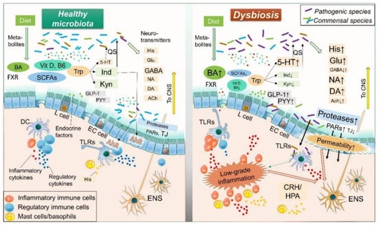 Collectively, NA, DA, and ACh appear to function as communication tools between microbes, the mucosal immune system, and brain activity, and thus dysbiosis may result in their miscommunication [112].
