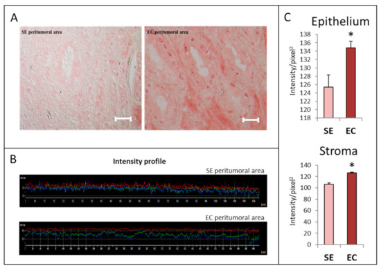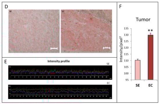 Representative images of HGF immunoreactivity (A,D) in seminoma (SE) and embryonal carcinoma (EC) samples (D), and their peritumoral areas (A). Representative intensity profiles of immunohistochemical experiments are shown in panel (B) (peritumoral areas) and (E) tumoral lesions. (C) Graphical representation of the quantification of HGF immunostaining in epithelial and stromal parts of SE and EC peritumoral areas. (F) Graphical representation of the quantification of HGF immunostaining in SE and EC samples. Four different SE histological samples and two EC histological samples were examined. Bar: 100 µm. * p < 0.005; ** p < 0.001.