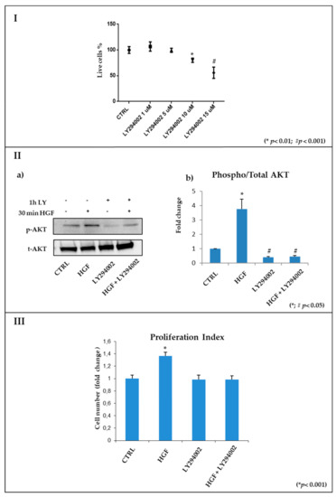 (I) Cell death Flow Cytometry nalysis. Graphical representation of the percentage of live cells obtained by culturing NT2D1 cells with different concentrations of LY294002 for 48 h (* p < 0.01; # p < 0.001). (II) Western blot analyses of p-AKT and total AKT in NT2D1 cell lines cultured in basal conditions (CTRL), with 5 µM LY294002, with 40 ng/mL HGF, and with LY294002 + HGF. On the left: representative images of p-AKT and total AKT bands, obtained by using stain-free technology (Bio-Rad Laboratories Inc., Hercules, CA, USA), are shown. On the right: the densitometric analysis of pAKT/AKT bands is reported (*; # p < 0.05). (III) Graphical representation of the number of NT2D1 cells cultured for 48 h in control conditions, with HGF, with LY294002, or their combination. Cells cultured with HGF had a high proliferative rate (* p < 0.001). Results were expressed in fold change, with the control considered as 1 (±standard error of the mean (SEM)).