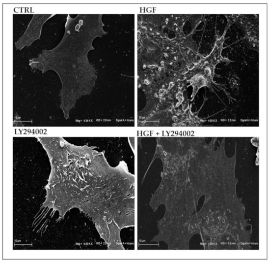 We also performed SEM analysis on LY294002 treated cells with or without HGF stimulation. We observed that the co-administration of LY294002 with HGF reverts the membrane morphology to the control condition. Intriguingly, LY294002 alone also appears to affect NT2D1 cell membrane activity, inducing the appearance of filopodia and microvilli-like structures, but to a lesser extent with respect to HGF administration (Figure 3). This result was surprising but highlights the relevance of microenvironmental cues in the modulation of NT2D1 cell behavior. Moreover, it explains, at least in part, the results that we obtained in the invasion assay (see below).