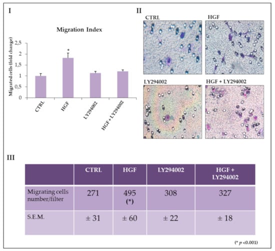 Effect of LY294002 on cell NT2D1 cell migration. (I) Quantitative analysis of chemoattracted NT2D1 cells. The values were calculated as “fold change” (±S.E.M.) compared to the control, which was considered as 1. The use of LY294002 in combination with HGF abrogates the migratory effect induced by HGF. (II) Representative images of NT2D1 cell migration. Images were recorded at 40× magnification. (III) Table illustrating the number of migrating cells/filter (* p < 0.001). At least three independent experiments were performed in triplicate.