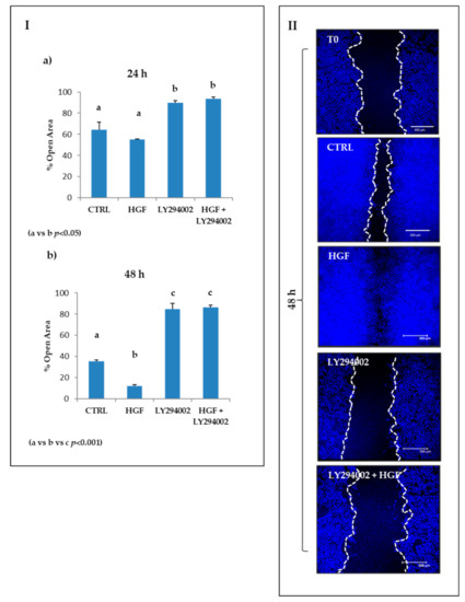 Wound-healing assays were performed using special double well culture inserts (Ibidi GmbH, Martinsried, Germany). Each insert was placed in a 24-well plate and 3.5 × 104 cells were placed into both wells of each insert with 70 μL of medium containing 2% FBS. At confluence, the culture inserts were gently removed, and cells were fed with fresh DMEM with 2% FBS or DMEM with 2% FBS containing HGF (40 ng/mL), LY294002 (5 µM), or both factors. Each well was photographed at 10× magnification immediately after insert removal for baseline wound measurement (T0), and after 24 h and 48 h with a Nikon DS-Fi1 camera (Nikon Corporation, Tokyo, Japan) coupled with a Zeiss Axiovert optical microscope (Zeiss, Oberkochen, Germany). TO-PRO3 iodide fluorescent dye 642/661 (1:5000 in PBS, Invitrogen, cat. T3605, Carlsbad, CA, USA) was used for nuclei staining. The mean percentage of residual open area compared with the respective open area recovered at T0 was calculated using ImageJ v 1.47 h software. For each experimental condition, four independent experiments were performed in triplicate.