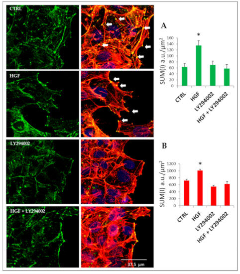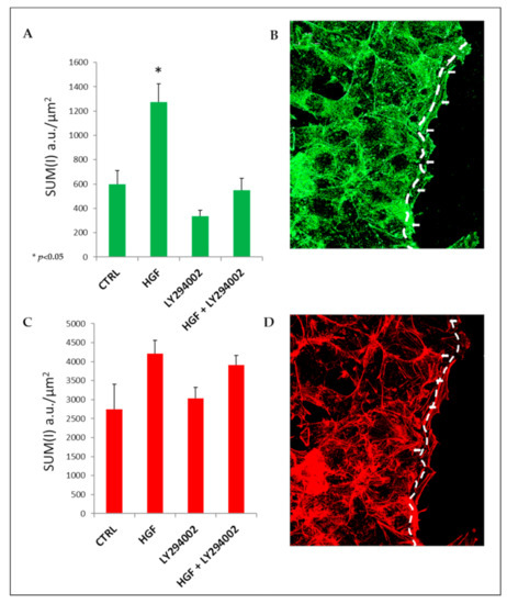 At the migration front of HGF-exposed cells, in addition to the cortical bundles, we also observed lamellipodia and membrane ruffles more frequently with respect to the control (Figure S1 dashed line). Interestingly, when NT2D1 cells were treated with LY294002 alone or in combination with HGF, stress fibers decreased drastically, together with detectable lamellipodia (Figure 7). The quantitative evaluation of F-actin using confocal software (Sum of intensity: (SUM(I) indicates an increase in F-actin after HGF administration, and that LY294002 co-administration completely reverts this phenomenon. These observations are in line with the reported inhibition of collective migration exerted by PI3K inhibition (Figure 6).