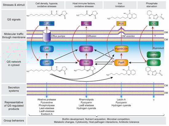 Hierarchical quorum-sensing (QS) network in Pseudomonas aeruginosa. The four QS pathways are activated in response to the cell density and environmental stimuli, with four autoinducer synthases including LasI, RhlI, PqsABCDH and AmbBCDE that produce N-3-oxo-dodecanoyl-ʟ-homoserine lactone (3O-C12-HSL), N-butyryl-ʟ-homoserine lactone (C4-HSL), 2-heptyl-3-hydroxy-4-quinolone (PQS) and 2-(2-hydroxyphenyl)-thiazole-4-carbaldehyde (IQS), respectively. Note: the autoinduction is depicted in red arrows; the receptor for IQS is still unknown. The QS products are secreted through the cell membrane, that control the group behaviours and essential for the adaptation, survival and pathogenicity of P. aeruginosa. Abbreviation: CM, cytoplasmic membrane; OM, outer membrane.