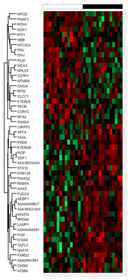 Hierarchical clustering heat-map of expression intensities of proteins reflects differential protein profiles in cerebrospinal fluid (CSF) of sporadic amyotrophic lateral sclerosis (sALS) cases (n = 15, black) compared with controls (n = 15, white). Differences between groups are considered statistically significant at p-value ≤ 0.05.