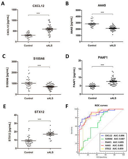 Quantification of CXCL12 (A), AAAS (B), S100A6 (C) PAAF1 (D), and STX12 (E) protein levels in the CSF in sALS (n = 43) and control (n = 36) cases using ELISA. Mean ± SEM is represented in the graphs. Differences between sALS patients and controls were assessed with a t-test. Significance was set at *** p < 0.001. (F) receiver operating characteristic (ROC) curves of CXCL12, AAAS, S100A6, STX12, and PAAF1 quantification in the differential diagnosis of sALS compared with controls. AUC values, corresponding to the area under ROC curves, and 95% confidence intervals are indicated.