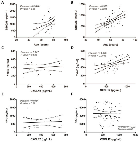 CSF levels of studied biomarkers were compared with several clinical variables, including age, sex, type of clinical symptoms at onset, ALS-FSR-R score, diagnosis delay, and disease progression. Associations between biomarker data and these parameters did not reveal significant correlations, except for age which correlated with S100A6 levels in control (Pearson’s r = 0.344; p = 0.05) (Figure 3A) and sALS cases (Pearson’s r = 0.575; p = 0.000) (Figure 3B). Additionally, biochemical associations with neurofilaments-L (NF-L) and chitinase 3 like 1 (YKL40) [4], revealed that CXCL12 levels did not correlate with control cases (Figure 3C), but correlated positively with YKL40 levels in sALS (Pearson’s r = 0.426; p = 0.003) (Figure 3D), but not with NF-L protein levels in controls (Pearson’s r = 0.14; p = 0.88) and sALS (Pearson’s r = −0.02; p = 0.88) (Figure 3E,F).
