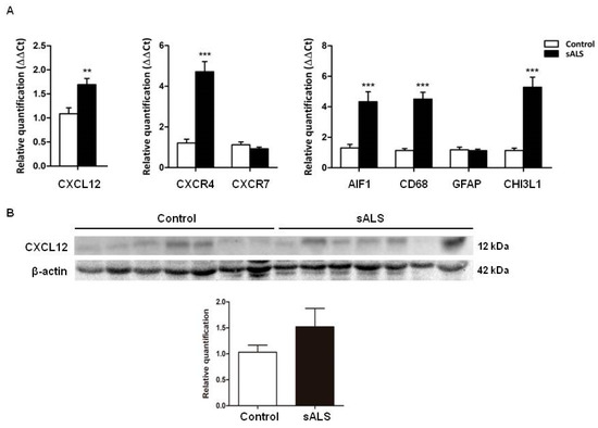(A) CXCL12, CXCR4, CHI3L1, CD68, and AIF1 mRNA expression is significantly increased in the anterior horn of the lumbar spinal cord in sALS when compared with controls; CXCR7 and GFAP mRNA expression is not modified in sALS when compared with controls. (B) Western blot analysis of anterior horn lumbar spinal horn lysates shows a trend of increased CXCL12 protein levels in sALS when compared with controls, but the difference from the control was not statistically significant. β-actin is used for normalization. Graphical representation of Western blots expresses fold changes in sALS relative to control cases. Mean ± SEM is represented in the graphs. Differences between sALS patients and controls were assessed with a t-test. Significance was set at ** p < 0.01 and *** p < 0.001.