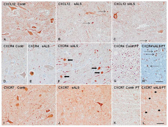 In the human spinal cord CXCL12 is mainly expressed in motor neurons; CXCL12 mRNA levels are increased in the anterior horn of the lumbar spinal cord in sALS, and CXCL12 protein expression is found in the remaining motor neurons in sALS, and in a few glial cells, although the total levels of the protein in the spinal cord homogenates in sALS are within the range of control levels. CXCR4 mRNA, but not CXCR7 mRNA, is up-regulated in the spinal cord in sALS; CXCR4 protein is localized in axonal spheroids and degenerating motor neurons in the anterior horn of the spinal cord, and in a subset of oligodendroglia-like cells in the pyramidal tracts in sALS, while CXCR7 localizes in motor neurons in control and sALS, and reactive astrocytes in the pyramidal tracts in sALS.