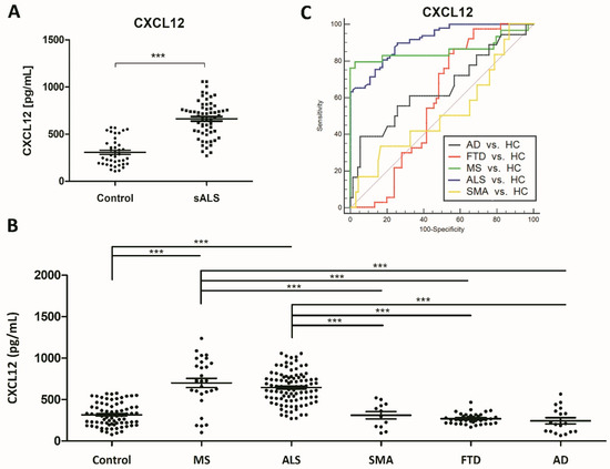 (A) Validation of CXCL12 CSF levels in the second cohort of sALS and control cases. Mean ± SEM is represented in the graphs. Differences between sALS patients and controls were assessed with a t-test. Significance was set at *** p < 0.001. (B) CXCL12 levels in different neurodegenerative disorders with cognitive decline or motor involvement. CXCL12 levels are significantly increased in sALS (the combination of the first and second cohort) and MS cases, whereas CXCL12 protein levels are not significantly altered in the CSF in AD, SMA, and FTD cases, compared with controls. Mean ± SEM is represented in the graphs. Differences between sALS patients and controls were assessed with a one-way ANOVA test. Significance was set at *** p < 0.001. (C) ROC curves of CXCL12 in Alzheimer’s disease (AD), spinal muscular atrophy III (SMA), multiple sclerosis (MS), and behavioral variant frontotemporal dementia (FTD).