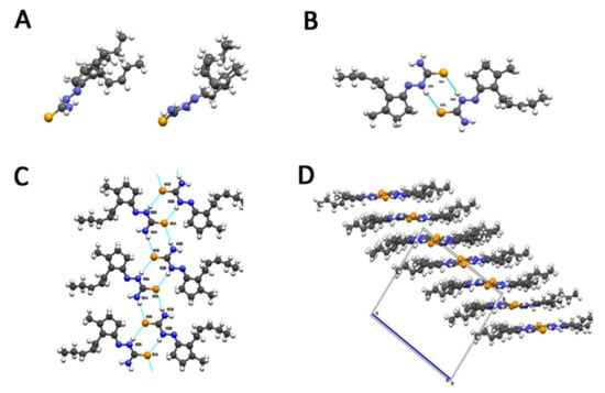 Sulfur S1 of the thiosemicarbazone is involved in a second intermolecular hydrogen bond with N4-H of a third molecule (Figure 1C). This bond is responsible for the formation of a second type of dimer-like structures which form ribbons developing along the a axis. As shown in Figure 1D, the packing of the crystal can be described as due to the stacking of planes formed alternatively by ribbons of heterodimers (A and B) and homodimers (C and C’). These layers are kept together by hydrophobic and π-π stacking interactions of the thiosemicarbazone moiety).