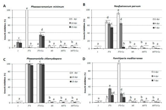 Effect of compounds on the growth of esca disease-linked species (A) P. minimum, (B) N. parvum, (C) P. chlamydospora and (D) F. mediterranea. Culture medium was amended with molecules at 25 μM concentration; values are reported as inhibition percentage as compared to the control (Dimethyl sulfoxide, DMSO, 0.25% v/v amended cultures) ± S.D. Different letters indicate statistically significant differences (p < 0.05).