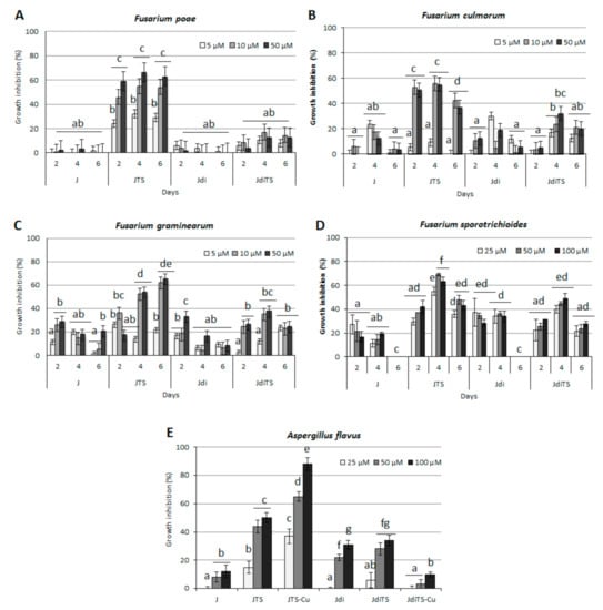 Observations conducted on all the relevant species at 50 µM concentration of test compounds showed the achievement, by JTS and JTS-Cu, of a total impairment of colony development at every dpi of evaluation (Figure S1).